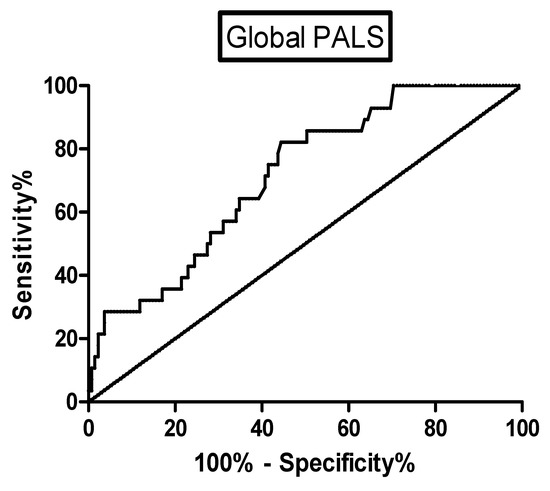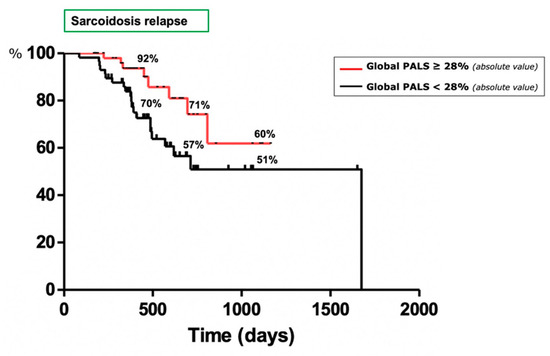 Regarding the control of sarcoidosis, 36 patients (24 females) showed a clinically relevant relapse of the disease during the follow-up (median time to event 428 days). We did not observe any significant differences of demographic, clinical, functional, radiological and therapeutic data between patients with a stable and worsening disease. An echocardiographic assessment revealed that patients with a relapse of sarcoidosis showed significantly lower values of EF%, TAPSE and global PALS (55.1 ± 10.2 vs. 57.8 ± 5.6 %, p = 0.0432; 19.7 ± 4.1 vs. 21.2 ± 3.3 mm, p = 0.0272; 25.6 ± 6.7 vs. 32 ± 8.2%, p = 0.0012, respectively) than patients with a stable disease during the follow-up. To compare the accuracy of these three indicators, ROC curves were plotted reporting the best performance for global PALS (AUC = 0.7155, p = 0.00034; sensitivity 64.3% and specificity 65.2% for a cut-off of 28.54) (Figure 3). Figure 4 shows the Kaplan–Meier curves of the study population stratified according to the cut-off of this indicator. We observed a higher probability of a sarcoidosis relapse in patients with a worse global PALS (log-rank test 4.411, p = 0.0357). The univariate Cox analysis confirmed that the global PALS values were significantly associated with a higher risk of a disease relapse (p < 0.001) as well as diabetes mellitus (p = 0.036) and global PACS (p = 0.003) (Table A3) but global PALS was the only parameter to show a significant impact on this outcome in the multivariate analysis (HR 12.736, 95% CI 1.850–87.664, p = 0.005) (Table A4).