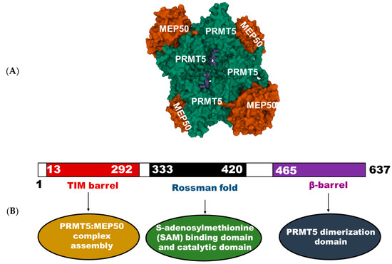 (A) Crystal structure of human PRMT5 in a heterooctameric complex with MEP50 (PDB ID: 4GQB). (B) Structural and functional domains of PRMT5.
