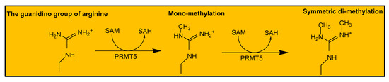 As already mentioned, PRMT5 is a type II PRMT that symmetrically mono- or di-methylates its substrates by catalyzing the transfer of methyl groups from SAM to arginine residues on a substrate protein (Figure 2). This results in the formation of mono- or di-methylarginine and one or two molecules of SAH [21]. The methyltransferase function of PRMT5 is facilitated by critical conserved residues within the Rossman fold and the β-barrel domain. For example, during the methylation of a substrate protein such as histone 4 (H4), the arginine residue of H4 binds into a tunnel-like region composed of tryptophan (W) 579, phenylalanine (F) 327, and leucine (L) 312. These residues form favorable interactions with the substrate protein, thus enabling the arginine residue access to PRMT5’s active site. The active site of PRMT5 contains two conserved glutamate (E) residues, E435 and E444, which form two hydrogen bond with the terminal guanidino nitrogen atom of arginine [9]. Then, F327 further orients the substrate’s arginine for efficient transfer of the methyl group. F327 has been shown to reinforce the specificity of PRMT5 for the generation of symmetric dimethylation products. The product specificity role of F327 is evident from the formation of asymmetric dimethylated H4R3 when F327 is mutated to methionine [20]. Collectively, these critical residues of PRMT5 position a substrate protein in the best conformation for efficient catalysis, leading to the modulation of a protein’s function.