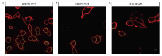 Stable expression of (A) SST2, (B) SST4, or (C) SST5 receptors in HEK293 cells. Red staining (Cy3) confirms SST receptor expression in cells. 40× magnification; bar = 20 μm. SST = somatostatin.