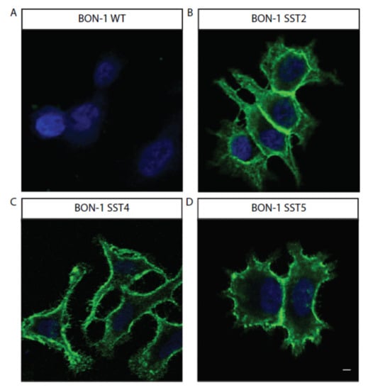 Stable expression of SST receptors in BON-1 cells: (A) wild-type cells (B) SST2 receptor, (C) SST4 receptor, or (D) SST5 receptor. Green staining (Alexa488) confirms SST receptor expression in cells. 63× magnification; bar = 20 μm. SST = somatostatin.