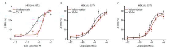 A fluorescence-based membrane potential assay [24] examined the activation of the co-expressed individual SST receptors and the GIRK2 channels in the HEK293 cells following treatment with SS-14, octreotide, pasireotide, and veldoreotide (representative traces shown in Figure S2). The concentration-response curves revealed that veldoreotide, similar to SS-14, stimulated the SST2, SST4, and SST5 receptors with high potency and efficacy in the HEK293 cells, co-expressing these receptors with the GIRK2 channels (Figure 4; Table 1). The half-maximal effective concentration (EC50) of veldoreotide was between that of octreotide and pasireotide for activating the SST2 receptor and was comparable with pasireotide for activating the SST5 receptor. Veldoreotide revealed a high efficacy for activating the SST4 receptor based on the effective maximum (Emax) values, in contrast with octreotide and pasireotide. The Emax values of the SST4 receptor agonist J-2156 at the SST4 receptor in the HEK293 cells stably expressing this receptor were similar to those observed with veldoreotide.
