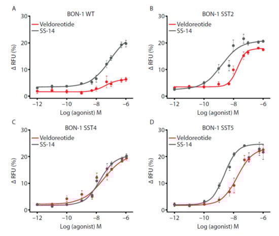 Analysis of exogenous (A) wild-type, (B) SST2, (C) SST4, or (D) SST5 receptors in BON-1 cells. Cells were exposed to 10−12 M to 10−6 M SS-14 or veldoreotide. Concentration-response curves were generated using data from four independent experiments performed in duplicate (mean ± SEM). Changes in fluorescence with agonists were subtracted from changes in fluorescence with vehicle. RFU = relative fluorescence units; SEM = standard error of the mean; SST = somatostatin.