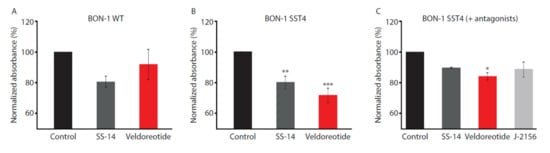Cell proliferation in (A) wild-type BON-1 cells or BON-1 cells expressing SST4 receptor following treatment with (B) 10 µM SS-14 or (C) 10 µM veldoreotide for 24 h at 37 °C. In C, SST4 receptor agonist J-2156 was compared with SS-14 and veldoreotide. Antagonists to the SST2 receptor (BIM23454) and SST5 receptor (BIM23867) were used. Data shown were generated from three to four independent experiments performed in duplicate (mean ± SEM). Absorbance data for cells treated with agonists were normalized to vehicle (control). * p < 0.05 vs. control; ** p < 0.01 vs. control; *** p < 0.001. SEM = standard error of the mean.