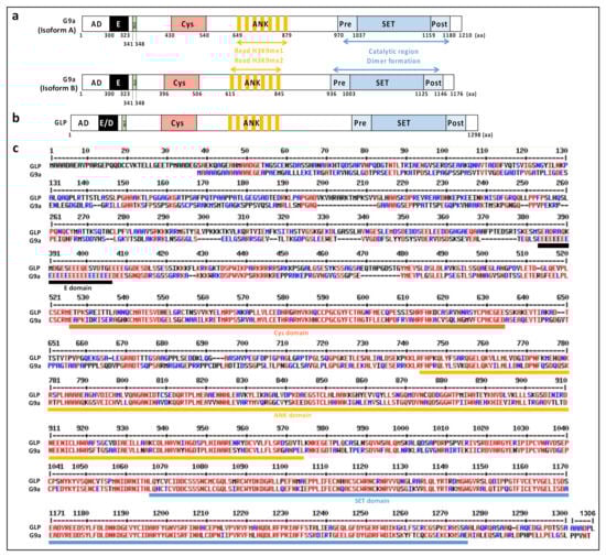 Schematic representation of the structure and domains of human G9a (a) and GLP (b). G9a and GLP contain different domains: an activation domain (AD), a Cys-rich region (Cys), an ankyrin repeat domain (ANK), and a SET domain composed of a core SET domain associated with pre- and a post-SET domains. G9a and GLP contain a nuclear localization signal (NLS). G9a also contains a Glu-rich region (E) and GLP a Glu/Asp-rich region (E/D). (c) Sequence alignment of G9a (NP_006700.3) and GLP (NP_079033.4). The alignment was performed using the MultAlin program [26] (http://multalin.toulouse.inra.fr/multalin) (accessed on 7 October 2021). Amino acids with 100% and >60% conservation are shown in red and blue, respectively.