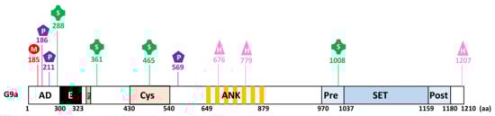 As for most proteins, G9a is subjected by many PTMs that regulate its ability to bind new partners and impact its cellular functions (Figure 2). Further details about their cellular features will be given in the corresponding sections below.
