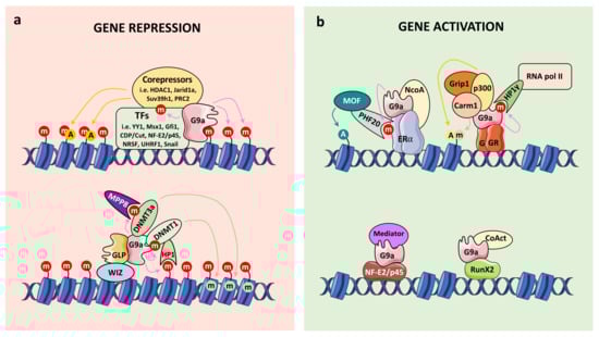 G9a acts as a transcriptional coregulator, either as a corepressor (a) or coactivator (b). (a) After G9a recruitment by some transcription factors (TFs), G9a methylates histones (red circles) leading to chromatin remodeling and gene repression. G9a also recruits corepressor proteins (i.e., other PKMTs and chromatin remodelers) and DNA methyltransferases (i.e., DNMT3a and DNMT1) in order to fully repress transcription via histone modifications (i.e., acetylation (orange circles) and DNA methylation (green circles)). Of note, G9a also methylates some TFs and DNA methyltransferases modulating their functions. (b) Conversely, G9a recruitment by the glucocorticoid receptor (GR), estrogen receptor (ERα), RunX2 and NF-E2/p45 leads to gene activation through the recruitment of specific coactivators (CoAct) (i.e., histone acetyltransferases and methyltransferases) and the transcription machinery (i.e., Mediator complex or RNA polymerase II).