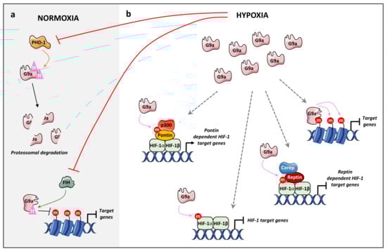 In mammalian cell lines, G9a activity was reported to increase under hypoxic conditions, concomitant to an increase in total H3K9me2 levels, resulting in gene silencing [103]. In G9a-/- mouse embryonic stem cells under hypoxic conditions, the level of H3K9me2 was significantly lower, demonstrating that G9a was involved in hypoxia-induced H3K9me2 [103]. The hypoxic upregulation of G9a was attributed to specific PTMs (Figure 4). As described previously, G9a is hydroxylated at residues P676 and P1207 by PHD1 in order to target G9a toward proteasome degradation via ubiquitinylation [44]. Hypoxia induces PHD1 inhibition and a subsequent upregulation of G9a, leading to an increase in H3K9me2 and the silencing of a specific subset of target genes. Casciello et al demonstrated that G9a inhibition decreases proliferation, migration, and in vivo tumor growth [44]. Likewise, in ovarian cancer, FIH reaction was limited under hypoxia, leading to a reduced expression of metastasis-suppressor genes via H3K9 methylation [45]. Mechanistically, FIH induces hydroxylation of G9a on N779, impairing its ability to bind mono- and dimethylated H3K9, and thus methylate H3K9 [45] (Figure 4).