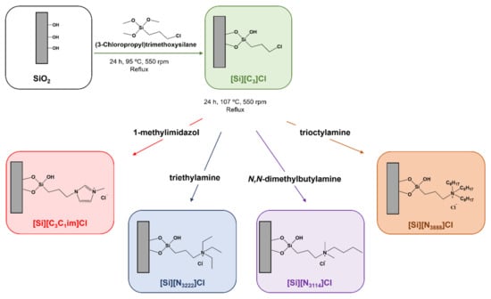 The preparation of the chromatographic supports was achieved by the chemical modification of silica with each IL and in accordance with procedures previously reported by our research team [28,29,30]. Briefly, 5 g of silica were initially immersed in hydrochloric acid (37%) for 24 h, and then washed with double distilled water and dried under vacuum at 105 °C to ensure its activation. The second stage of the reaction involves the dispersion of the activated silica in 60 mL of toluene, followed by the addition of 5 mL of 3-chloropropyltrimethoxysilane. The reaction solution was magnetically stirred (550 rpm) and heated (115 °C) under reflux for 24 h. After refluxing, the reaction was stopped and the modified silica was cooled down to room temperature and washed with 100 mL of toluene, 200 mL of ethanol-water (1:1, v/v) mixture, 500 mL of distilled water, and 100 mL of methanol. Then, the material was dried under vacuum at 60 °C for 24 h. Aiming the chemical modification of silica with 1-methyl-3-propylimidazolium chloride, the dried chloropropyl silica ([Si][C3]Cl) was then mixed with 5 mL of 1-methylimidazol and 60 mL of toluene, and the reaction proceeded for 24 h under reflux at 107 °C with 550 rpm of stirring.