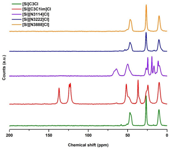 The successful preparation of the SILs was confirmed through solid-state 13C NMR, as shown in Figure 2. Unlike IL-functionalized silica, the 13C NMR spectrum of the chloropropyl silica does not contain characteristic signals originating from moieties present in the ILs, confirming the effectiveness of the modification process. The NMR spectra for all samples of SILs exhibit three similar signals at 10, 24, and 51 ppm, which are attributed to the three carbon atoms of the propyl alkyl chain of the chloropropyl silica.