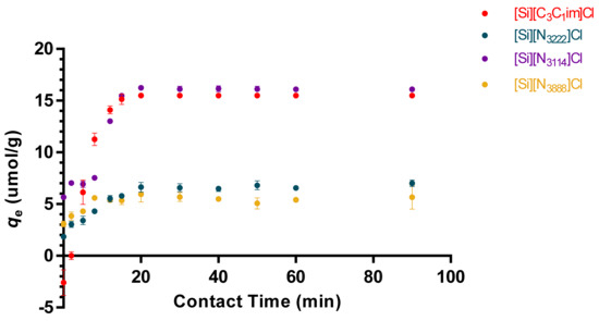 Under the described conditions, a plateau in the equilibrium concentration of adsorbate in the solid phase (qe) was reached approximately at 20 min, which was maintained up to the 90 min of time evaluated. According to the results shown in Figure 3, the initial adsorption rate of tRNA onto the material surface is high and fast, meaning an initial strong, non-covalent binding of tRNA onto the sorbent surface, followed by the saturation of the supported material at qe. Altogether, these results indicate that interactions between the modified supports and tRNA molecules are strong and occur quickly. In addition, when using 10 mM Tris-HCl as the binding buffer, the tRNA binding capacities in the solid phase reached 16.3 and 15.6 µmol.g−1 for [Si][N3114]Cl and [Si][C3C1im]Cl (the best identified materials), respectively. The maximum equilibrium concentration of adsorbate in the solid phase of the IL-modified supports decreases in the following order: [Si][N3114]Cl > [Si][C3C1im]Cl > [Si][N3222]Cl > [Si][N3888]Cl.