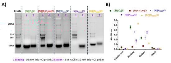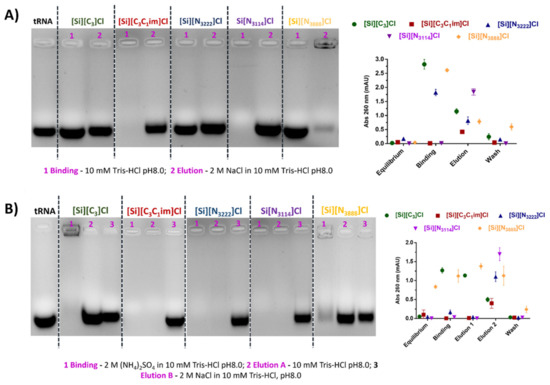 Overall, the elution with NaCl allowed the total recovery of tRNA using the supports [Si][N3114]Cl and [Si][C3C1im]Cl since the biomolecule was not detected in the washing step (Figure 4B). With these supports, it is additionally observed that the binding/elution percentage is 100 (Figure 4A,B, in the agarose gel electrophoresis and UV spectroscopy), indicating no losses of the target biomolecule. Based on the exposed, the promising results regarding the high capacity and the high biomolecule recoveries (virtually 100%) displayed by the supports [Si][N3114]Cl and [Si][C3C1im]Cl are highly encouraging envisaging the scale up of this technology. Different types of non-covalent interactions are established with the target biomolecule, which can be explored in preparative liquid chromatography of nucleic acids towards an increase in the selectivity of such purification processes. The recognition of tRNA by the immobilized ligands can be explained by the negative charge, structural diversity and, consequently, the nucleotide bases exposure on tRNA species, characteristics that are important for their interaction with supports [36].