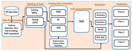 We developed our proposed ensemble model by integrating three different state-of-the-art machine learning classifiers. The overall workflow of the proposed research study has been shown in Figure 1. First, we extracted the data from the KICO dataset by removing the redundant data from it. The dataset consisted of so many inconsistencies and irrelevant information which were not in line with our target research goal. We needed to identify all those irrelevant data and discard them from the cohort of our dataset. Second, the most relevant features have been selected from the high dimensional dataset using the recursive feature elimination (RFE) technique. Third, the dataset has been divided into training and testing datasets, i.e., 80% for training the model and 20% for the testing of the model. Fourth, as our data were imbalanced, we needed to balance it so that we can get the optimal performance of the model without any model overfitting. To address this problem, we applied the data oversampling technique (SMOTE) [28] which makes the data balanced for the implementation of models, and then all the five base classifiers were trained. We applied hyperparameter tunning to get the optimal result of the base classifiers. Fifth, the results of all the base classifiers were combined to develop our proposed ensemble-based model. Sixth, the proposed ensemble model was evaluated by calculating the performance measures such as accuracy, precision, recall, and F1-score. Lastly, the model predicts all the four stages of IPF exacerbation occurrences and makes classification as its output.