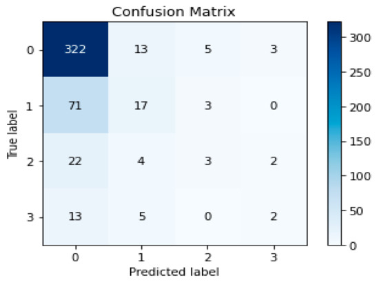 Basically, a confusion matrix represents a tabular summary of the model. It shows the number of correctly and incorrectly predicted values by the classifier. It provides better intuition pertaining to the performance of the model. It has two dimensions, one dimension represents the actual classes, the other dimension shows the classes predicted by the model. The confusion matrix of the proposed model has been shown in Figure 2. On the y-axis, it represents the actual class labels from 0 to 3 which denote mild IPF disease, IPF exacerbation stage 1, IPF exacerbation stage 2 and, IPF exacerbation stage 3, accordingly. Furthermore, the predicted labels have been shown on the x-axis of the confusion matrix table. The values in the diagonal showed the IPF disease prediction rate of each class. Moreover, the proposed soft-voting ensemble class had a satisfactory IPF disease prediction.