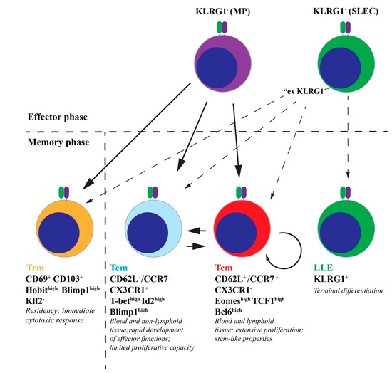 Differentiation and heterogeneity of memory CD8 T cells. Following the resolution of acute infection, the majority of effector CD8 T cells die off through the process of apoptosis. KLRG1- cells preferentially survive and differentiate into all of memory CD8 T cell linages. However, some of the KLRG1+ cells lose the expression of KLRG1 (“ex-KLRG1+”) and also seed the memory compartment. A small proportion of terminally differentiated KLRG1+ cells survive as “long-lived effector” (LLE) cells. Memory compartment consists of resident memory (Trm), effector memory (Tem) and central memory (Tcm) cells. MP (memory precursor); SLEC (short-lived effector cells).