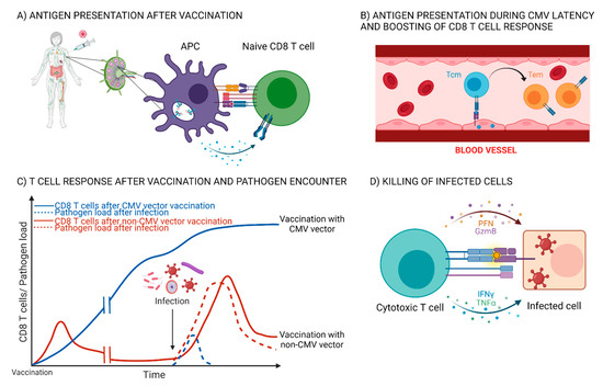 The bulk of effort in vaccine development has been received by humoral based immunization approaches [13]. However, as the intricacies of CD8 T cell biology became better known, a benefit of utilizing their cytotoxic properties and breadth of their epitope targeting for developing successful vaccines became apparent [14]. There is substantial evidence implicating CD8 T cells as the major determinant of protection not only against numerous viral and bacterial pathogens, but also in the fight against neoplastic cells [15,16,17]. Therefore, in this review we discuss the current evidence implicating CD8 T cells as important targets of vaccination strategies against pathogens and tumors. We also discuss the heterogeneity of memory CD8 T cell populations and their importance in the protection of the host. Finally, we describe several different attempts to use a common human pathogen, cytomegalovirus (CMV), as a vaccine vector with excellent properties for the induction of a potent and effective CD8 T cell response against vectored antigens. Although adequate CD8 T cell response cannot be generated without CD4 T cell help and this has to be taken into account when designing effective vaccine strategies [18], in this review, we focus exclusively on CD8 T cell biology.
