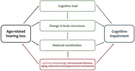 Several theories have been proposed to explain the interactions and common pathophysiological mechanisms of cognitive decline and hearing impairment. They include increased cognitive load, changes in brain structure and function, common genetic and pathologic causes, and social disengagement.