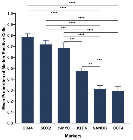 Statistical analyses of cell counting in 12 lung adenocarcinoma tissue samples. The graph demonstrates statistically significant differences between the mean proportion of cells stained positively for the cancer stem cell marker CD44 and each of the stemness-associated markers. All markers were significantly different except SOX2, c-MYC and CD44 which were not significantly different, nor were OCT4 and NANOG. CD44 had the highest mean proportion of positive cells, followed by SOX2, c-MYC, KLF4, NANOG and OCT4. Error bars: 95% confidence interval. ** p < 0.01; *** p < 0.001; **** p < 0.0001.