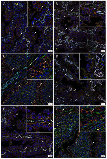 Representative immunofluorescence-stained images of lung adenocarcinoma tissue samples demonstrating expression of stemness-associated markers. OCT4 ((A–C), green) and NANOG ((A), red), SOX2 ((B), red) and KLF4 ((C), red) were expressed on the cells within the tumor glands (arrowheads). The expression pattern was predominantly cytoplasmic and was observed within the nucleus of some cells. OCT4 ((C), green) was exclusively expressed by cells within the stroma adjacent to tumor glands (arrows). c-MYC ((D–F), green) and NANOG ((D), red), SOX2 ((E), red) and KLF4 ((F), red) was expressed by cells within the tumor glands (arrowheads). The expression pattern was predominantly cytoplasmic and was observed within the nucleus of some cells. c-MYC ((F), green) was exclusively expressed by cells within the stroma adjacent to tumor glands (arrows). Nuclei were counterstained with 4′,6′-diamidino-2-phenylindole ((A–F), blue). Original magnification: 400×; n = 3. The insets show enlarged views of the corresponding images.