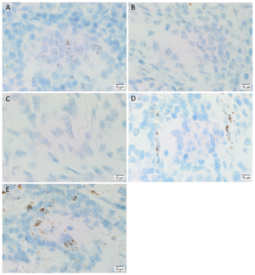 Representative in situ hybridization images of lung adenocarcinoma tissue samples demonstrating expression of mRNA transcripts for stemness-associated markers. Expression of OCT4 ((A), brown), NANOG ((B), brown), SOX2 ((C), brown), KLF4 ((D), brown) and c-MYC ((E), brown) can be observed at the mRNA level. Nuclei were counterstained with hematoxylin ((A–E), blue). Original magnification: 1000×; n = 6.