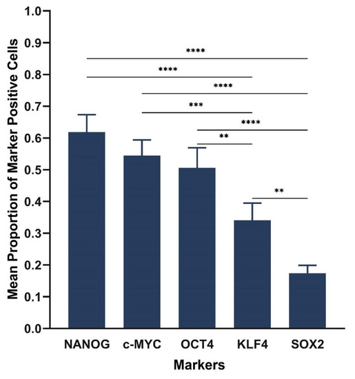 Statistical analyses of cell counting results for in situ hybridization stained slides of six lung adenocarcinoma tissue samples. The graph demonstrates statistically significant differences between the mean proportion of cells stained positively for each stemness-associated marker (p < 0.0001). There were significant differences between all the stemness-associated markers except OCT4, NANOG and c-MYC which were not significantly different. NANOG had the highest mean proportion of positive cells, followed by c-MYC, OCT4, KLF4 and SOX2. Error bars: 95% confidence interval. ** p < 0.01; *** p < 0.001; **** p < 0.0001.