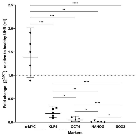 Using primary cell lines derived from five of the 12 LA tissue samples, RT-qPCR demonstrated mRNA expression of c-MYC, KLF4, OCT4 and NANOG relative to healthy UHR, with SOX2 below detectable levels (Figure 6). c-MYC was increased above the baseline of 1 of UHR, but not above a 2-fold increase. KLF4, OCT4 and NANOG were below 0.5 of baseline, hence a greater than 2-fold decrease, meaning less mRNA was detected for these markers in the LAPCLs compared with the healthy UHR. The expected size amplicons were observed, and no products were observed in the no template control (NTC) and no reverse transcriptase control (No RT) reactions (Figure S5). This data suggests a hierarchy from most to least abundant of c-MYC, KLF4, OCT4, NANOG and SOX2. Statistical analyses demonstrated that all differences between the markers were statistically significant after adjustment was made for multiple comparisons with the Holm–Bonferroni method (F = 934.3, d.f. = 4,6.9, p < 0.0001). For SOX2, no amplification cycle crossed the threshold, consequently a value of 43 was used as a minimum.