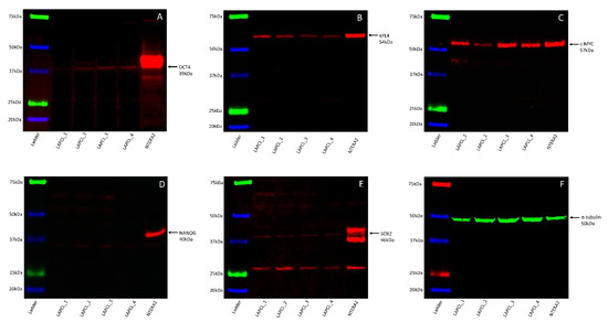 WB on the four LA-derived primary cell lines demonstrated expression of OCT4 in three out of four samples at approximately 39 kDa (Figure 7A), KLF4 in all four samples at approximately 54 kDa (Figure 7B), and c-MYC in all four samples at approximately 57 kDa (Figure 7C). SOX2 (Figure 7D) and NANOG (Figure 7E) were below detectable levels in all four samples but was detected in the NTERA-2 cells at the expected molecular weights of approximately 46 kDa (Figure 7D) and 40 kDa (Figure 7E), respectively. α-Tubulin confirmed approximate equivalent protein loading for all four LA-derived primary cell lines at approximately 50 kDa (Figure 7F). The NTERA-2 cells confirmed specificity for the five stemness-associated markers. The full-length WB images are shown in Figure 1 are presented in Figure S6.