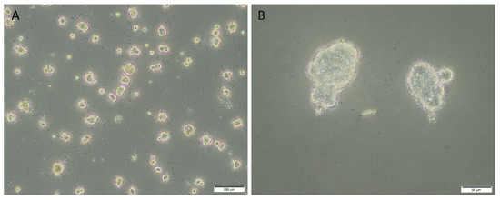 The first LA-derived primary cell line demonstrated evidence of positive initial tumorsphere formation. Eighty percent of the spheres passed the 50 µm threshold after three days (Figure 8A,B), with early signs of dark necrotic centers, and the spheres had an average diameter of 63.81 µm. Measurement of the second LA-derived primary cell line demonstrated that 0% of spheres measured had passed the 50 µm threshold after 10 days, and the spheres had an average diameter of 29.06 µm. Measurement of the third LA-derived primary cell line demonstrated that 17.6% of spheres measured had passed the 50 µm threshold after 10 days. The spheres had an average diameter of 49.71 µm. Measurement of the fourth LA-derived primary cell line demonstrated that 13% of spheres measured had passed the 50 µm threshold after 10 days with an average diameter of 38.90 µm. Details of the in vitro initial tumorsphere assays results are presented in Table 1.