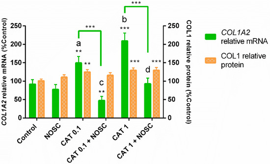 Regarding COL1A2 mRNA transcription, the NOSC treatment differed from CAT 0.1 and 1 µg/mL treatments, and the differences are shown in Supplementary Table S1.