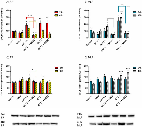 In MLP, CAT 0.1 µg/mL increased COL1A2 mRNA transcription at 48 h compared to the control group (p < 0.05; Figure 2B), but the addition of NOSC reduced this effect (p < 0.01; Figure 2B). In addition, in MLP, CAT 1 µg/mL treatment was capable of increasing COL1A2 mRNA transcripts when compared to the control at both 24 h (p < 0.05; Figure 2B) and 48 h (p < 0.001; Figure 2B). Nevertheless, explant treatment with CAT 1 µg/mL + NOSC diminished COL1A2 mRNA transcription in MLP at both 24 h (p < 0.01; Figure 2B) and 48 h (p < 0.001; Figure 2B) when compared to the respective CAT 1 µg/mL treated groups. The COL1 protein abundance augmented with CAT 1 µg/mL and CAT 1 µg/mL + NOSC treatments, relative to the respective control groups, in MLP at 48 h (p < 0.001; Figure 2D).