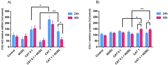 Additionally, CAT 1 µg/mL, when compared to CAT 0.1 µg/mL, showed a higher increase of COL1 protein relative abundance at 48 h. However, the combined treatment of CAT 1 µg/mL + NOSC was more effective in reducing it at 24 h than after a 48 h incubation. The highest concentration of CAT was more prone to induce COL deposition at the longest period of treatment, while NOSC treatment as an anti-fibrotic agent was more efficient at the shortest time of treatment. Thus, the highest concentration of CAT was responsible for the greatest pro-fibrotic effect.