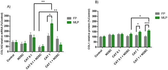 In MLP, CAT 1 μg/mL increased the most COL1A2 mRNA transcription compared to CAT 0.1 μg/mL (p < 0.01; Figure 4A). The combination of CAT 0.1 μg/mL + NOSC diminished COL1A2 mRNA transcripts in FP (p < 0.01; Figure 4A) and COL1 relative protein abundance in MLP (p < 0.05; Figure 4B) more than CAT 1 μg/mL + NOSC. In MLP, CAT 1 μg/mL elevated both COL1A2 mRNA transcription and protein relative abundance of COL1 more than in FP (p < 0.05; Figure 4A,B), whereas CAT 1 μg/mL + NOSC decreased COL1 protein relative abundance in FP more than MLP (p < 0.001; Figure 4B).