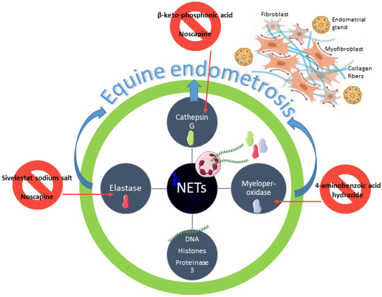 Schematic representation of neutrophil extracellular traps (NETs) putative involvement in equine endometrosis establishment. Endometrosis is characterized by fibroblast differentiation into myofibroblasts and collagen deposition around the endometrial glands [25,26,27]. A continuous influx of neutrophils to the endometrium leads to excessive formation of NETs and long standing of NETs components, such as DNA, histones, proteinase 3, elastase, cathepsin G, and myeloperoxidase [1]. Elastase, cathepsin G, and myeloperoxidase are capable of inducing collagen deposition in the equine endometrium [13]. Sivelestat sodium salt, β-keto-phosphonic acid, and 4-aminobenzoic acid hydrazide are selective inhibitors of elastase, cathepsin G, and myeloperoxidase that reduced collagen deposition in equine endometrium explants [15,16,17]. Noscapine, an alkaloid used to treat cough, cancer, and fibrosis, also reduced collagen in vitro deposition in equine endometrium, induced by elastase [47] and cathepsin G.