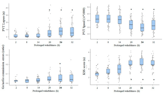 PVT lapses and speed, Go/noGo commission errors, and Karolinska sleepiness (KSS) scores during prolonged wakefulness. Results are median, 25% and 75% range, and individual points. * A significant difference with the values at 2 h of wakefulness.