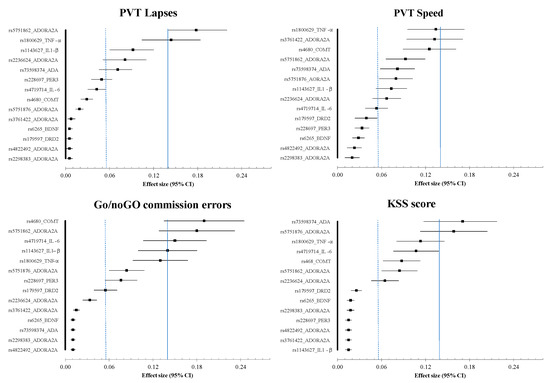 Figure 2 shows the large difference between mutated and ancestral alleles for the 14 SNPs on cognitive tasks and KSS score. The ES shows a large significant effect on PVT lapses for the rs5751862 of ADORA2A and TNF-α polymorphisms, as well as a medium significant effect for IL1-β and the rs2236624 of ADORA2A. We found that 16.1% of the total variance was explained by the rs5751862 of ADORA2A, 11.7% by TNF-α polymorphism, and 7.1% by IL1-β and 6.5% by rs2236624 of ADORA2A.