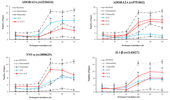 Average number of PVT lapses across consecutive 6 h intervals during 32 h of prolonged wakefulness for ADORA2A (rs2236624 and rs5751862), TNF-α, and IL1-β polymorphisms. For reference, the average number of lapses on PVT across consecutive 6 h intervals is shown for the most resilient, intermediate, and vulnerable tertiles of our sample without genotypes selection. * A significant difference with the ancestral profile (blue line).