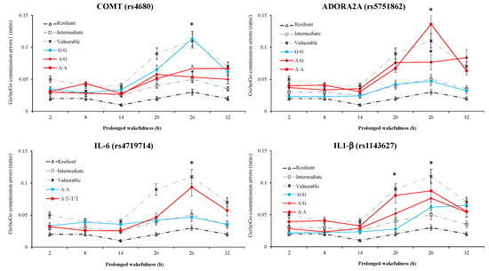 Average commission errors (ratio) on Go/noGo task across consecutive 6 h intervals during 32 h of prolonged wakefulness for COMT, ADORA2A (rs5751862), IL-6, and IL1-β polymorphisms. For reference, the average number of commission errors on Go/noGo across consecutive 6 h intervals is shown for the most resilient, intermediate, and vulnerable tertiles of our sample without genotypes selection. * A significant difference with the ancestral profile (blue line).