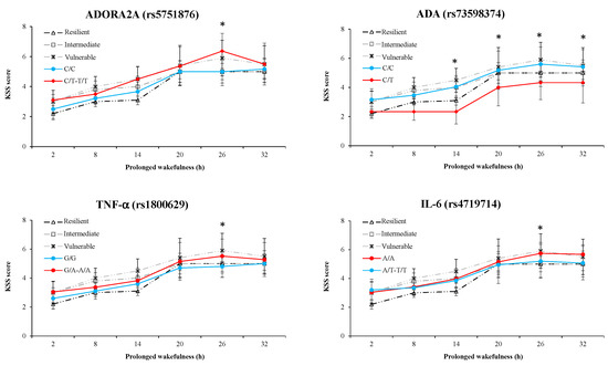 Average KSS (Karolinska Sleepiness Scale) scores across consecutive 6 h intervals during 32 h of prolonged wakefulness for ADORA2A (rs5751876), ADA, TNF-α, and IL-6 polymorphisms. For reference, the average KSS score across consecutive 6 h intervals is shown for the most resilient, intermediate, and vulnerable tertiles of our sample without genotype selection. * A significant difference with the ancestral profile (blue line).