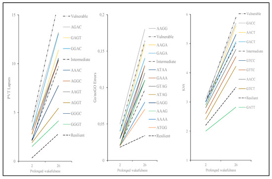 Average PVT lapses, Go/noGo commission errors, and KSS score after 2 h and 26 h of prolonged wakefulness for each SNP combination (see Table 4).