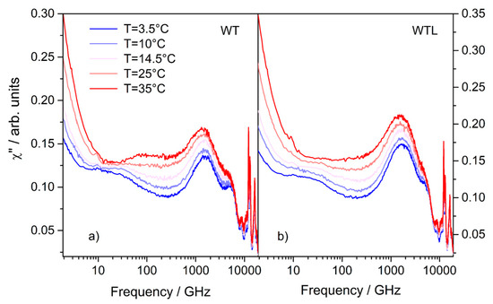 EDLS measurements for both WTL and WT solutions were performed from 3.5 °C to 35 °C (namely, T = 3.5, 10, 14.5, 25, 35 °C). The susceptibility spectra, obtained after reconstruction of the entire profiles, are reported in Figure 1 as a function of frequency (ν = ω/2π). The spectra were normalized to the high-frequency peaks (>10 THz) corresponding to the Raman active modes of trehalose as visible in Figure S1.