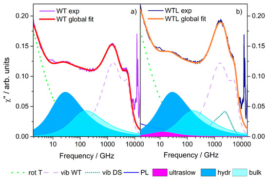 The analysis of the WTL ternary mixture was, on the other hand, very complex. Over the whole range investigated, up to 10 THz, the acquired spectrum (dark blue line in Figure 1b) is more intense than that corresponding to the binary system. This was due to the lysozyme contribution that must be carefully considered. A method to obtain a very good reproduction of all the spectral signatures (orange line in Figure 2b) was developed by some of us [15] by combining the fitting results of WT binary data with that of the so-called difference spectrum (DS), as discussed in detail in Reference [15]. In particular, the residual component, obtained as a difference of WTL and WT spectra, after proper normalization, could bring out the protein contribution (see Figure S3), highlighting the presence of (i) the protein structural relaxation, well reproduced by a power law (PL, Figure 2b), ∝ ν−0.3 [35,44,45] and (ii) the solvent-free lysozyme vibrational modes (, Figure 2b), modeled with three BO functions, due to librational motions of solvent-exposed side chains and to backbone torsions [35,38,46], and also including the so-called “Boson peak,” arising from collective protein vibrations [38]. Beyond that, an additional component (see Figure S3) associated with a dynamics slowed down by a factor ξ~15–20 with respect to bulk water was detected, revealing the presence of a fraction of ultraslow water molecules in the trehalose-containing system [15]. It has to be stressed that this ultraslow component was not present in the spectrum of the binary WL solution, where only the protein hydration contribution with ξ~6–8 appears [35,42].