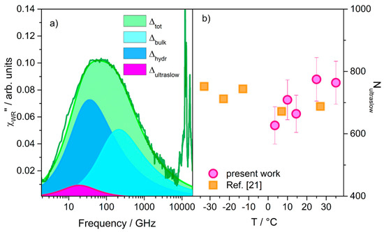 (a) difference profile (see text) and curves from the best-fit analysis that reproduce the water relaxation dynamics evidencing ultraslow, hydration, and bulk features. (b) The number of ultraslow water molecules hydrating lysozyme (circles) calculated as described in the text, and corresponding MD values (squares) estimated from Figure 2 of Reference [21].