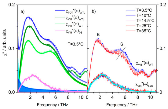 vib WT, the vibrational contributions of the WT mixture, given by the sum of inter-molecular B&S modes, referred to as ; vib DS, the vibrational contribution (arising from lysozyme) of the difference spectrum, namely , and finally superslow, hydration, and bulk water relaxations, the sum of which provides the term