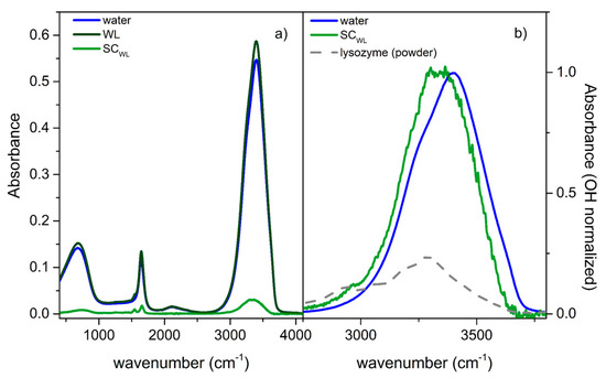 Figure 5a shows the ATR-FTIR spectrum of the WL solution compared with the rescaled spectrum of neat water and the resulting SC-IR spectrum. This latter evidences the protein’s amide I and amide II bands at 1650 and 1550 cm−1, respectively, which are sensitive to its secondary structure [54,55,56]. In parallel, Figure 5b displays a comparison in the high-frequency region (2800–3800 cm−1)—sensitive to H-bonding interactions—between the spectrum of pure water due to the OH stretching modes SC-IR spectrum of the lysozyme solution, after normalization to the maximum intensity. Most of the SC-IR spectrum intensity accounts for the OH stretching vibrations of water molecules whose H-bonding features are affected by the solute. Contributions from the perturbed water are expected to be dominant in this OH stretching region compared to the direct contributions arising from the protein, mostly related to NH stretching vibrations [57]. This is qualitatively supported by comparing the SC-IR spectrum with the IR spectrum of solid lysozyme, normalized to the feature at around 2900 cm−1, due to the protein CH stretching modes. The comparison also underlines that the lysozyme signals would mainly affect the SC-IR spectrum at around 3200 cm−1. As a result, the intensity redistribution towards lower frequencies observed going from the spectrum of pure water to the SC-IR one could be explained considering the formation of relatively stronger H-bonds within the protein hydration shell than pure water. In other words, the protein seemed to induce an average strengthening of the H-bonds of hydrating water, as reflected by the reduction of the OH population involved in weaker H-bonds, present in neat water and resonating at higher frequencies (>3400 cm−1).