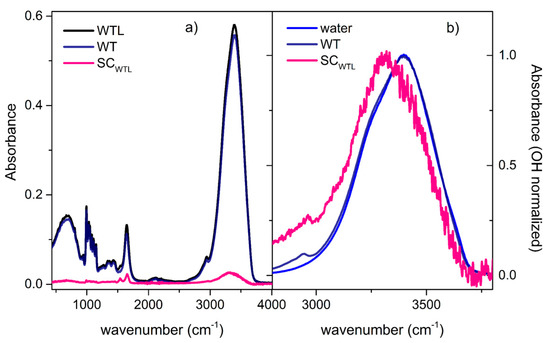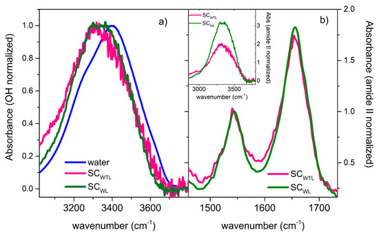 Figure 6a shows the spectrum of the ternary WTL solution, the rescaled spectrum of the binary WT solution, which represents the protein solvation medium in the ternary solution, and the resulting SC spectrum. In this case, this latter highlights the lysozyme amide bands at 1650 and 1550 cm−1, while a good compensation is achieved for the signals of trehalose, which are visible in the 1000–1500 cm−1 region of the solution spectra. The OH stretching region of the SC-IR spectrum is better visualized in Figure 6b; for the sake of comparison, the maximum-normalized spectrum of the neat water and the binary WT solution are also reported. The SC-IR spectrum of lysozyme in the ternary mixture is distributed to lower frequencies with respect to that of the solvent, represented by the binary WT solution. Thus, as before, the presence of lysozyme induces an average strengthening of H-bonding interaction, which would mainly relate to the formation of new OH···L links within the protein solvation shell. The presence of direct lysozyme contributions at around 3200 cm−1 is not expected to invalidate this qualitative conclusion.