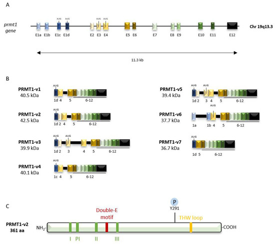 Genomic organization and protein structure of PRMT1. (A) Genomic organization of the PRMT1 gene which spans 11.3 kilobases (kb) and possesses 12 constitutive exons including exon 1 subdivided into 4 alternative exons, represented by a scale of blue-colored boxes; (B) Exon composition of the different PRMT-1 isoforms (v1 to v7). The sequences of intron boundaries are represented by the black boxes. Molecular weight of each protein isoform is indicated in kilodaltons (kDa); (C) Protein structure of PRMT1-v2. The PRMT signature motifs (I, Post-I (PI), II, III) as well as double-E motif, the THW loop and the phosphorylation site Y291 are represented (adapted from [5,6]).