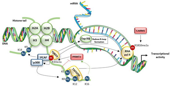 - Yang, Y.; McBride, K.M.; Hensley, S.; Lu, Y.; Chedin, F.; Bedford, M.T. Arginine methylation facilitates the recruitment of TOP3B to chromatin to prevent R-loop accumulation. Mol. Cell 2014, 53, 484. [Google Scholar] [CrossRef]
