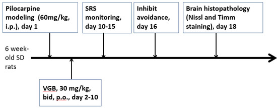 The rats were then divided into an experimental group (VGB) (orally fed 30 mg/kg of VGB twice daily for 7 consecutive days, days 2–9) and a control normal saline (NS) group (orally fed normal saline daily for 7 consecutive days). Each group contained 7 animals in each set of experiments. After this latent phase of epileptogenesis (days 2–9), the rats gradually developed chronic epilepsy characterized by spontaneous recurrent seizures (SRS). We started monitoring the seizure frequency in the rats on days 10–15 after status epilepticus. Each rat was monitored with a video camera set above the cage 8 h per day for 5 consecutive days [24,26]. All monitoring of the SRS was conducted by a trained technician blinded to the experimental design. The videos were watched to identify any evidence of seizure behavior (running, jumping, rearing, lordosis, an erect tail, and so on). If any seizure-like activity was seen, the video was stopped and viewed again to evaluate the behavior for possible seizures. The experimental protocol is shown in Figure 1.
