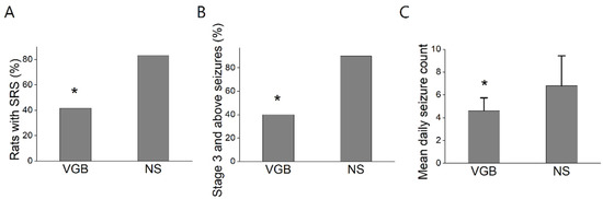 VGB-treated rats had fewer spontaneous recurrent seizures. (A) The VGB-treated group had fewer rats with SRS, compared to the normal saline group (VGB: 41.67%; NS: 183.33%, * p < 0.05). (B) The VGB group had fewer severe seizures (stage 3 and above), as compared to the NS group (VGB: 40%; NS: 90%, * p < 0.05). (C) The mean count of daily seizures for the VGB group was significantly lower than that for the NS group (VGB: 4.6 ± 1.14; NS: 6.8 ± 2.62, * p < 0.05) (N = 7 in each group).