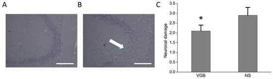 VGB-treated rats had less post-status epilepticus chronic hippocampal damage. The VGB group (A) had significantly less neuron loss in the hippocampal CA3 region than was the case in the NS group (B) (the arrow shows the cresyl violet staining). A blind semi-quantitative analysis (C) showed that the VGB group had significantly less hippocampal neuronal damage compared with the NS group (* p < 0.01) (N = 7 in each group). The scale bar = 200 μM.